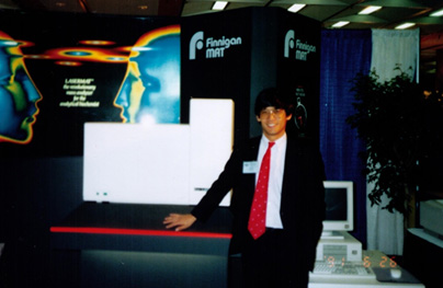 首批商業(yè)化MALDI-TOF產(chǎn)品出現(xiàn)于上個(gè)世紀(jì)90年代初,由Dr.Marvin Vestal創(chuàng)建的Vestec公司(被PerSeptive Biosystems收購(gòu)后又并入Applied Biosystems Inc公司)及本人當(dāng)時(shí)所在的Finnigan公司在1990年分別開(kāi)發(fā)生產(chǎn)出MALDI-TOF產(chǎn)品。Finnigan開(kāi)發(fā)的LaserMAT飛行時(shí)間質(zhì)譜儀是首款采用氮?dú)饧す馄鞯木€性MALDI-TOF產(chǎn)品,飛行管長(zhǎng)度只有0.5米。而Vestec生產(chǎn)的飛行時(shí)間質(zhì)譜儀采用了更長(zhǎng)的飛行管,因此性能會(huì)好一些。下圖是作者在1991年LaserMAT產(chǎn)品展臺(tái)前的留影。