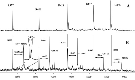 相比蛋白和多肽,核酸的MALDI-TOF分析比較遲后,直到Becker研究小組1993報(bào)道了3-羥基吡啶甲酸(3-HPA)可作為良好的基質(zhì)才有所突破。其中一個(gè)爆發(fā)點(diǎn)是應(yīng)用于基因位點(diǎn)的單核苷酸多態(tài)性鑒定。1997年Applied Biosystems的Haff和Smirnov首先建立了利用單堿基延伸(Single-base Primer Extension)化學(xué)與MALDI-TOF相結(jié)合的單核苷酸多態(tài)性(SNP)鑒定的質(zhì)譜方法。這一SNP檢測(cè)的主要優(yōu)勢(shì)在于可以在一個(gè)樣品反應(yīng)體系中同時(shí)檢測(cè)多達(dá)幾十個(gè)SNP位點(diǎn)(如圖所示乳腺癌1號(hào)基因的檢測(cè))。