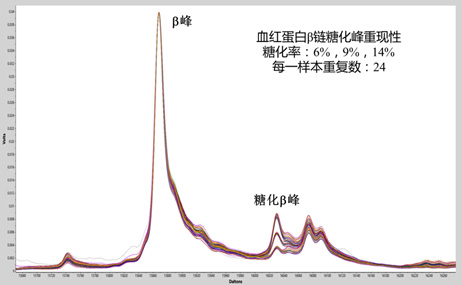 新一代MALDI-TOF的定量分析性能提升可以從全血樣品中血紅蛋白糖化率測(cè)定上看出。下圖中所示為3個(gè)不同糖化率的血紅蛋白樣本(分別為6%,9%,14%),每個(gè)樣本被重復(fù)點(diǎn)在靶板上24個(gè)不同樣點(diǎn)所獲得的72張質(zhì)譜光譜圖的疊加。糖化峰三組不同濃度離子強(qiáng)度的重現(xiàn)性高達(dá)98%以上。