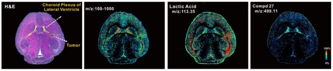 該篇文獻結(jié)合了融智生物QuanIMAGE快速、高分辨率質(zhì)譜成像系統(tǒng)的應用,實驗數(shù)據(jù)顯示,篩選出的新分子實體代表(文中稱為:Compd27,m/z:499.11)在小鼠體內(nèi)能夠可以很好地突破血腦屏障(BBB,Blood-BrainBarrier),成功到達腦腫瘤病灶所在區(qū)域。