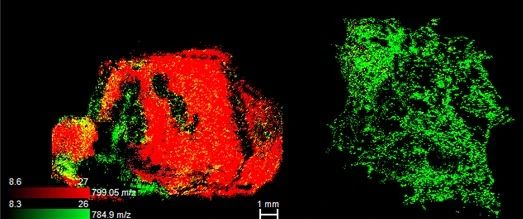 在m/z=784.9時,發(fā)現(xiàn)在癌變組織中有高表達(右),在癌旁組織中,隨著離癌變組織距離越遠(yuǎn),其表達快速下降(左)。