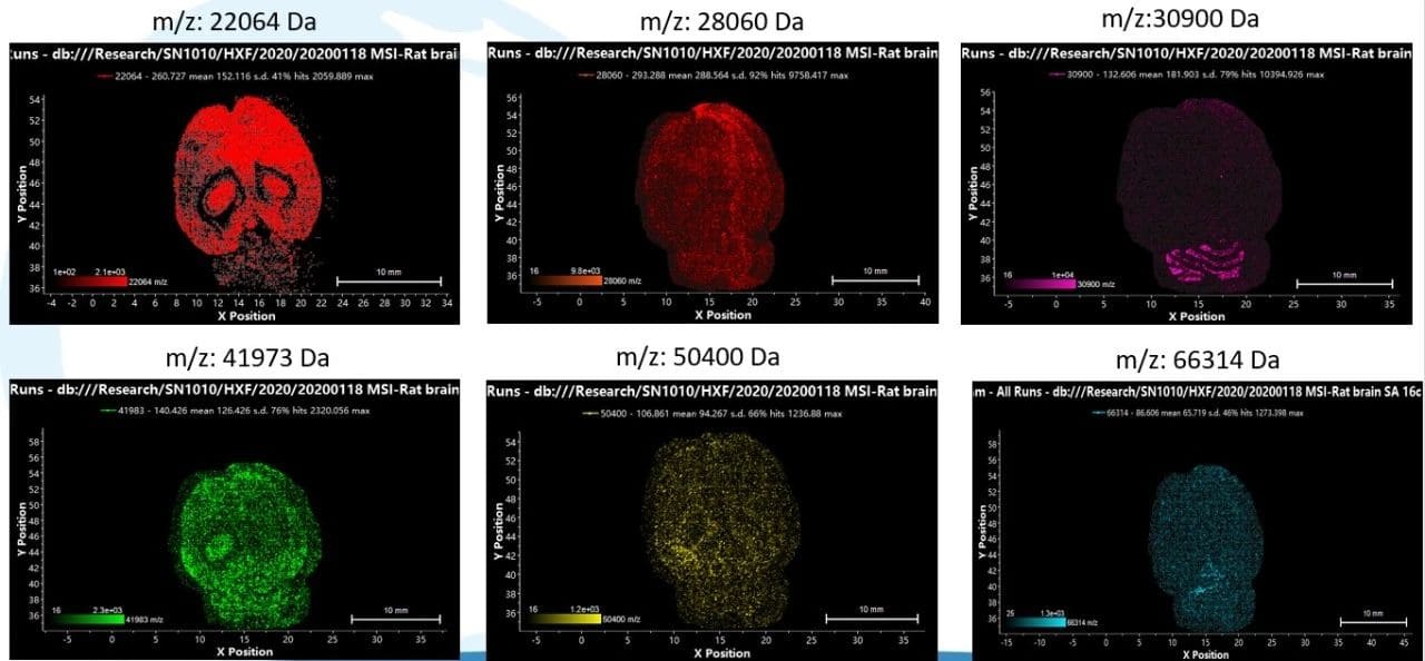 Nature為我們提出了應(yīng)當(dāng)關(guān)注的技術(shù),但這些技術(shù)真正發(fā)展起來應(yīng)用于臨床問題的解決,還需要科研人員大量的辛勤工作。在這方面,我們中國企業(yè)扎實地做出了不少成績。通過一系列核心技術(shù),極大地提升了MALDI-TOF MS分析大分子的靈敏度和分辨率(中國分析測試協(xié)會2019年驗證結(jié)果,10fmol信噪比大于200,BSA),因而能夠在條件嚴(yán)苛的成像質(zhì)譜技術(shù)中,實現(xiàn)對m/z大于20000的蛋白分子進行直接成像,能夠?qū)崿F(xiàn)大于300像素/秒的成像速率,為質(zhì)譜成像技術(shù)真正能夠走入臨床應(yīng)用,做好了科學(xué)儀器端的基礎(chǔ)工作。臨床病理分析專家,你們感興趣Nature提出的關(guān)注方向嗎?