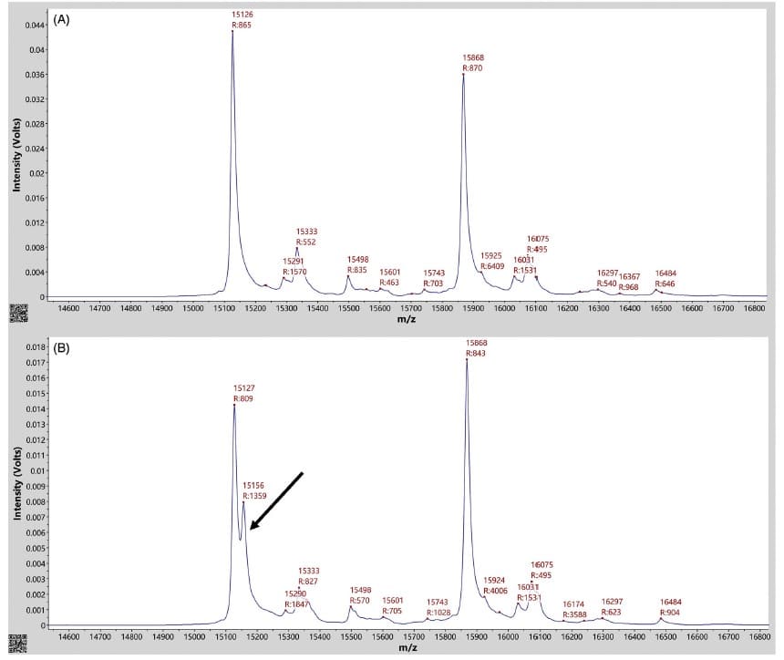 圖1. 對照組和Hb南昌的MALDI-TOF質譜圖。(A)對照品的質譜圖顯示α鏈(15126 Da)和β鏈(15868 Da),以及相應的糖基化α鏈(15289 Da)和糖基化β鏈(16031 Da)。(B)箭頭表示變異α鏈峰值(15156 Da)。