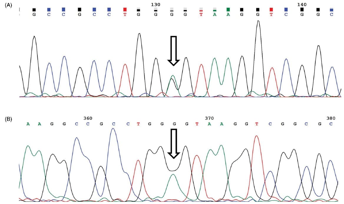 圖3. Sanger測序。(A) 正向引物. (B) 反向引物. 箭頭表示雜合突變Hb南昌(HBA2:c.46G>A)。